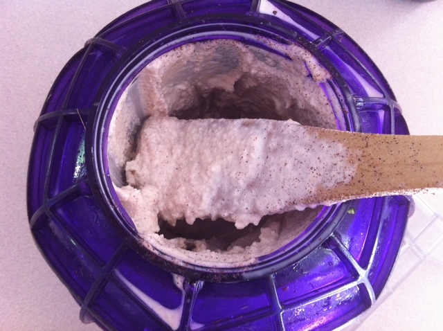 The vanilla ice cream recipe. Note that the cream tends to stick to the sides of the aluminum cylinder because that’s the coldest area. There is a softer center but the sides are very firm and take a minute to scrape off. That’s where you’ll see the most commercial-like ice cream consistency. Use a wooden spoon to scrape the ice cream off the sides. A metal spoon will leave scratches in the cylinder.