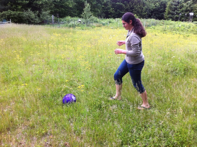 * Kids need to be careful kicking the ball. I suggested my teenage daughter wear sneakers when kicking the hard ball around but she insisted her flip flops were fine. She stubbed her toe a couple of times before she came up with the hill rolling option.