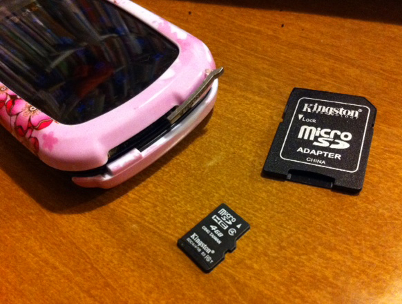 The mini card goes in to the base slot in her phone. To add more music to the card, she simply pops out the card, puts it in the adapter, puts that in to my laptop’s card reader then drags and drops mp3 files on to it.