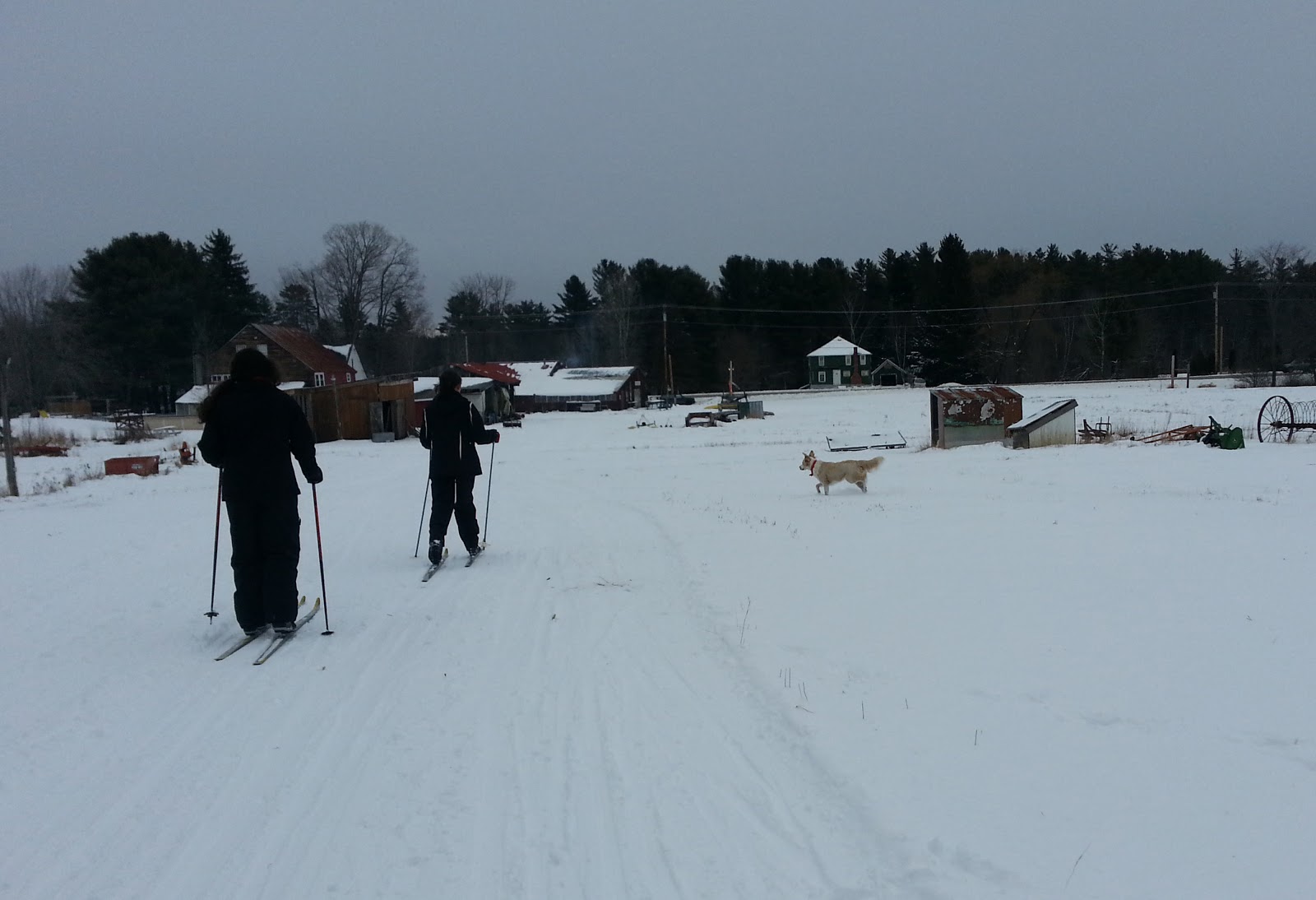 The kids and I enjoy cross-country skiing and try to expand our horizons every year with a visit to a new trail. After last year’s disappointing winter (and no big skiing adventures for us), we decided to visit Carter’s in Oxford for an easy, groomed-trail experience right after the big January snowfall (we’ve learned our lesson to not ignore a day of good trail conditions). We also made a new friend on the trail.